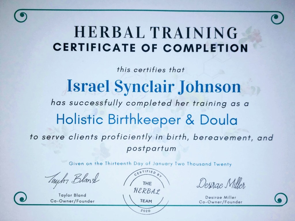 - Certified Doula and Birthkeeper (H.E.R.B.A.L) Holistically Empowered Rebel Birthkeeper Academy of Learning